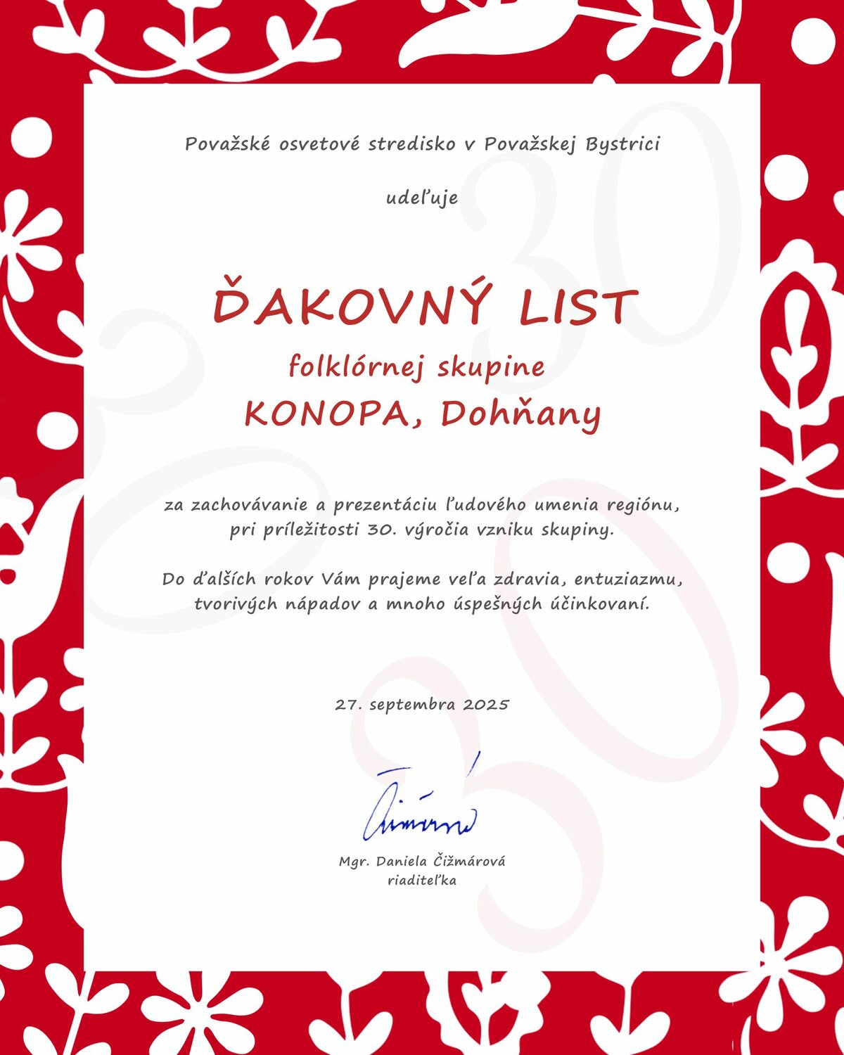 V sobotu 27. septembra 2025 sa v Dome kultúrnych tradícií v Dohňanoch uskutočnilo slávnostné stretnutie pri príležitosti 30. výročia založenia folklórnej skupiny Konopa.