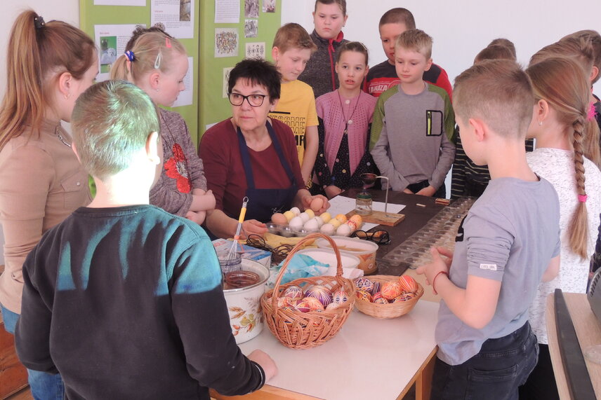 Považské osvetové stredisko v Považskej Bystrici pripravilo veľkonočné tvorivé dielne pre žiakov základných škôl. V rámci projektu Kultúra človeka, kultúra spoločnosti, ktorý z verejných zdrojov podporil FPU, sme sa venovali tradičnej domanižskej technike písania kraslíc. Deti sa oboznámili s históriou písania kraslíc v našom regióne - v Domaniži, kde sa tejto technike venovala Štefánia Dudáková – majsterka ľudovoumeleckej výroby.