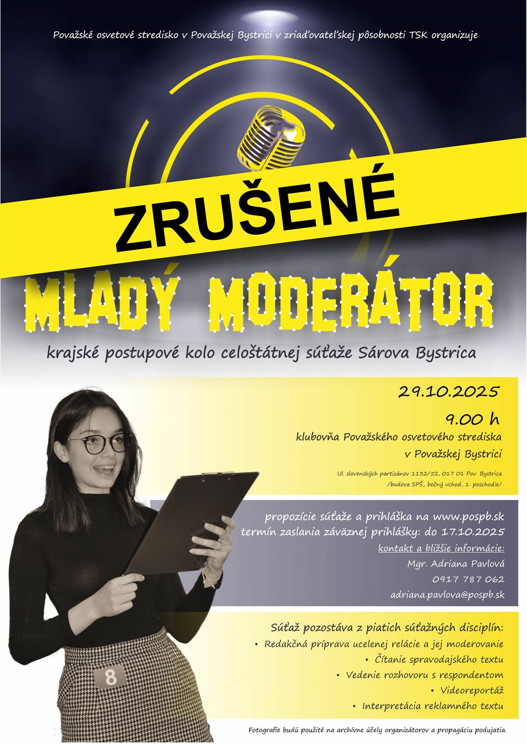 Pre nízky počet záujemcov je krajská súťaž Mladý moderátor, ktorá sa mala uskutočniť dňa 29.10.2025 v Považskom osvetovom stredisku v Považskej Bystrici, zrušená.