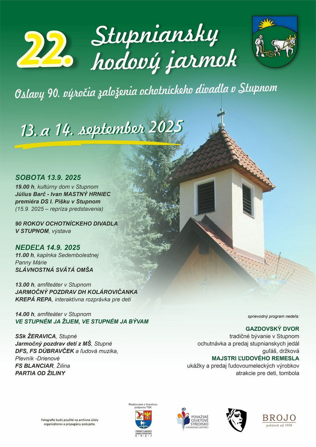 Obec Stupné a Považské osvetové stredisko v Považskej Bystrici s radosťou pozýva všetkých priaznivcov kultúry na 22. ročník Stupnianskeho hodového jarmoku, ktorý sa tento rok nesie v duchu významného výročia – 90 rokov založenia ochotníckeho divadla v Stupnom.