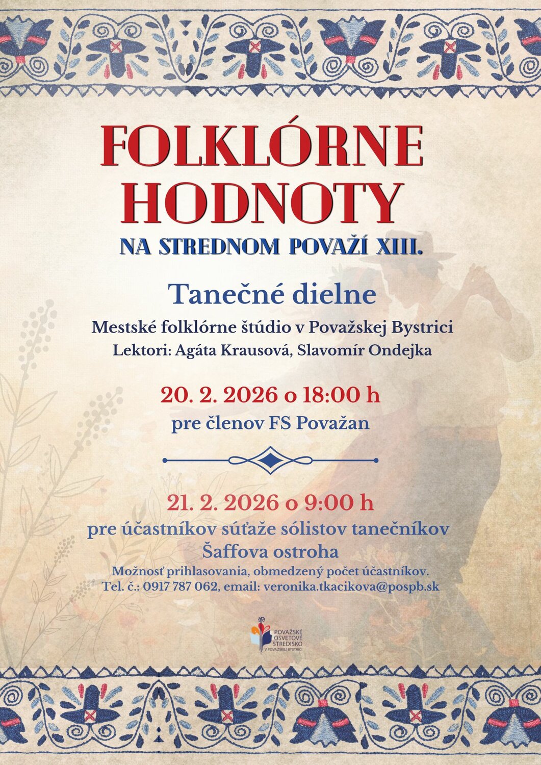 Pozývame vás na 13. ročník dielní „Folklórne hodnoty na strednom Považí“, tentokrát zameraný na tanečné dielne pod vedením lektorov Agáty Krausovej a Slavomíra Ondejku.