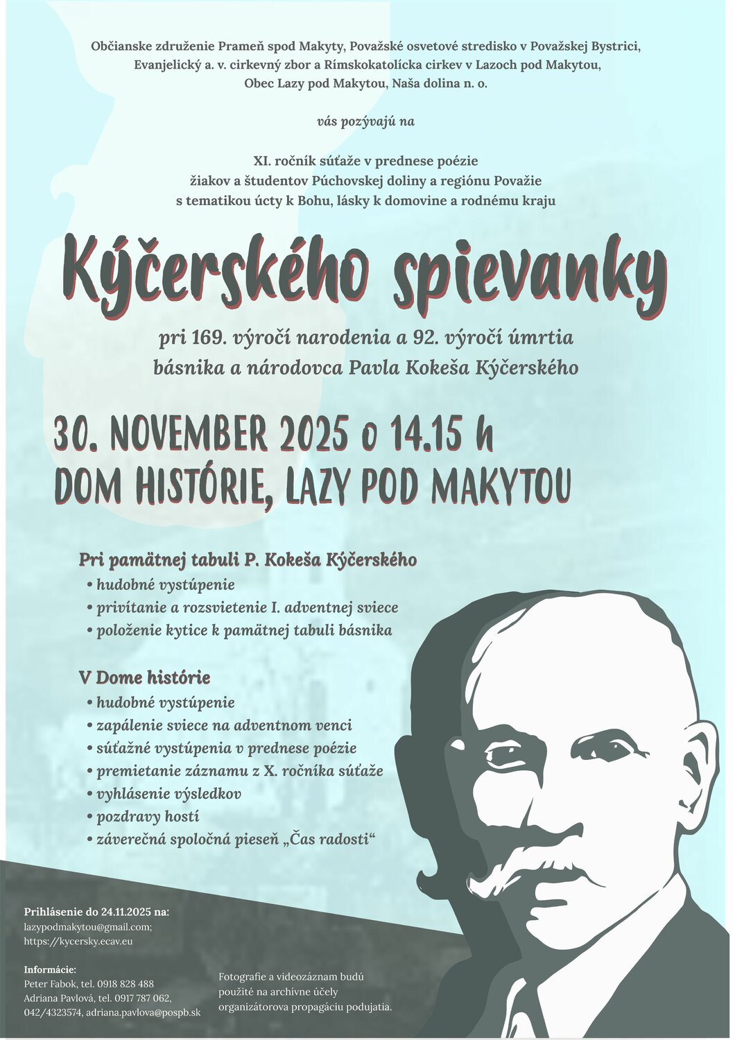 V nedeľu 30. novembra 2025 o 14.15 h sa v Dome histórie v Lazoch pod Makytou uskutoční XI. ročník podujatia Kýčerského spievanky, ktoré každoročne otvára adventný čas. Súťaž je spomienkou na významnú osobnosť regiónu, rodáka, evanjelického farára a básnika Pavla Kokeša Kýčerského.