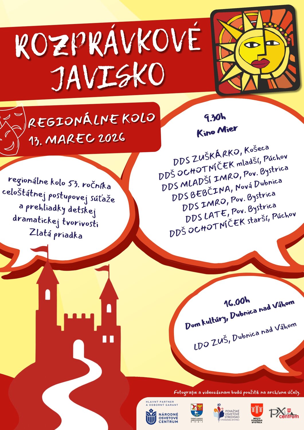 Považské osvetové stredisko v Považskej Bystrici Vás pozýva na regionálne kolo celoštátnej postupovej súťaže a prehliadky detskej dramatickej tvorivosti Rozprávkové javisko, ktoré sa uskutoční v piatok 13. marca 2026 v kine Mier v Považskej Bystrici a v Dome kultúry, Dubnica nad Váhom.