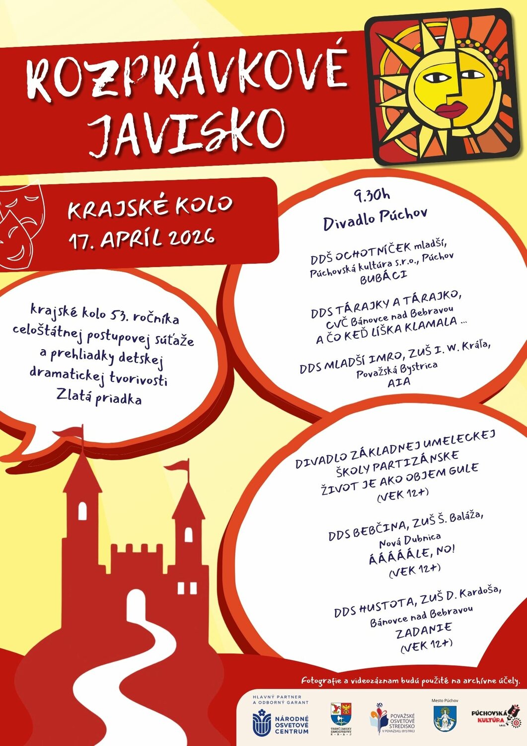 Považské osvetové stredisko v Považskej Bystrici, Mesto Púchov a Púchovská kultúra, s.r.o. Vás pozývajú na krajskú prehliadku detskej dramatickej tvorivosti Rozprávkové javisko, ktorá sa uskutoční v piatok 17. apríla 2026 v Divadle Púchov.