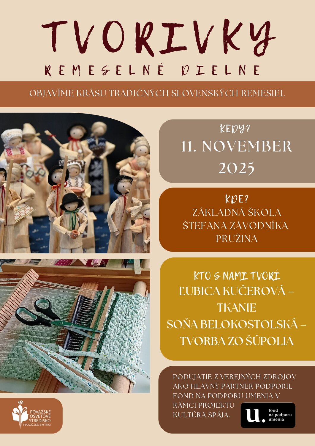 Považské osvetové stredisko v Považskej Bystrici pripravuje podujatie TVORIVKY – remeselné dielne, kde deti objavia krásu tradičných slovenských remesiel.