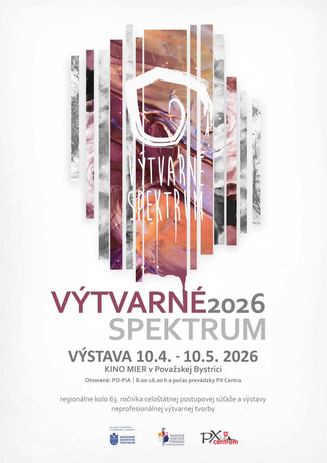 Srdečne Vás pozývame na výstavu diel z regionálneho kola celoštátnej postupovej súťaže Výtvarné spektrum 2026, ktorej vyhlasovateľom a odborným garantom je Národné osvetové centrum v Bratislave. Výstava predstavuje tvorbu 23 neprofesionálnych výtvarníkov z nášho regiónu vo viacerých výtvarných žánroch, prevažuje maľba, zastúpená je i kresba, insitná tvorba, či počítačová grafika. Výstavu si môžete pozrieť v kine Mier v Považskej Bystrici od 10. apríla do 10. mája 2026.